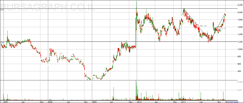 ניתוח טכני של מניית קומפיוג'ן מעלה תמונה מעניינת. המניה הספיקה לרדת ביותר מ-40% מתחילת 2011 ונגעה בשפל של אזור 1200 נקודות בחודש אוגוסט ומאז הספיקה לעלות ב- 60%. הנקודה המעניינת שקומפיוג'ן נימצאת ברצועה רחבה מאוד שהתחתית שלה היא אזור 1200 נקודות והרף העליון שמהווה גם את השיא של ה-5 שנים האחרונות נימצא ברמה של 2100 נקודות. זוהי רצועה רחבה מאוד וניתן לראות שבשנתיים האחרונות היו 3 נגיעות באזור של ההתנגדות ופעמיים המניה נבלמה באזור התמיכה.