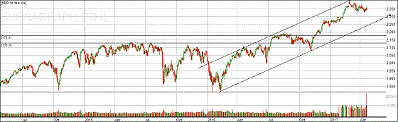 עדיין אין סימני חולשה ומדד האס אנד פי 500 נמצא קרוב לשיא כל הזמנים. כמוהו גם הנאסדק, הדאו ג'ונס והראסל. המגמה חיובית ונקודות השיא מסודרות בסדר עולה. תיקון אפשרי, עשוי לגרום לירידה עד רמת ה-2188 לכל היותר. קצב העלייה הוא כ-10% לשנה כך שיעד המחיר לסוף 2017 הוא סביב רמת ה-2,500.