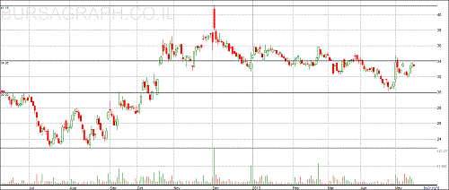 מתחילת 2013 המניה מדשדשת עם נטיה לירידות, מצב כזה של יציבות מהווה מנוחה וצבירת אנרגיה לקראת המשך המגמה ופריצה מעלה ולזה עלנו לחכות. ממרץ 2013 המניה מדשדשת בטווח המחירים 30-34. כאשר תתרחש פריצה של רמת התנגדות של ה-34, היא צפוייה לגרום לעלייה מהירה עד 41 ואף יותר מזה.