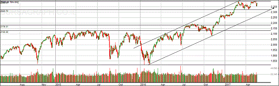 עדיין אין סימני חולשה ולמרות שהשבוע נטה לירידות, מדד האס אנד פי 500 נמצא קרוב לשיא כל הזמנים. כמוהו גם הנאסדק, הדאו ג'ונס, הראסל 2000, פוטסי, דקס ועוד. המגמה חיובית ונקודות השיא מסודרות בסדר עולה. קצב העלייה הוא כ-10% לשנה כך שיעד המחיר לסוף 2017 הוא סביב רמת ה-2,500, על פי קו המגמה- פלוס או מינוס 100 נקודות.