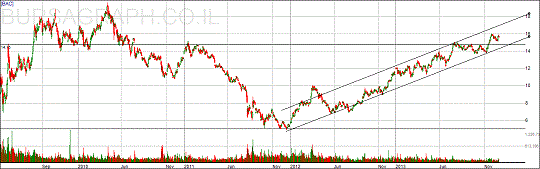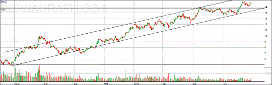 תעלת קווי המגמה קובעת מסלול ברור של עלייה עם נקודות שיא ושפל עולות. מיולי עד נובמבר השנה נוצרה התנגדות ברמה של 14.75$ שכאשר נפרצה בנובמבר מעלה הפכה לתמיכה וביחד עם קו המגמה יוצרת את נקודת הכניסה האידיאלית לקנייה. העובדה שלא נשבר שפל נמוך יותר במגמה ארוכת הטווח מגבירה את הסיכויים לשבירת השיא של 19.5$ ועל כן יעד המחיר הוא 20$ תוך חצי שנה. אם אכן נקנה ב-14.75$, נוכל לקבוע את חיתוך ההפסד ב-13.5$ שאם המחיר יגיע לשם גם יישבר קו המגמה העולה וגם יישבר שפל נמוך יותר מהקודם כך שהסיכויים להתחלת ירידה יהיו גבוהים ויתנו לנו איתות לצאת מיד מהקנייה