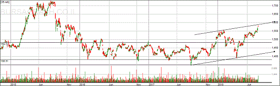 קצב העלייה בשנה האחרונה הוא כ-10% ועל כן התחזית היא עלייה של כ-5% עד סוף 2018. לפיכך יעד המחיר הוא כ-1620. אם תיפרץ רצועת הדשדוש העולה מעלה, נוכל לדבר על יעדים גבוהים בהרבה שיכללו את שבירת השיא של 2015 ברמת ה-1728.