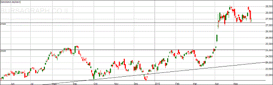 מאז מתייצב המחיר ויוצר תמיכה ברמה של 27,000 נקודות התנהגות שמאפשרת לנו לתכנן קנייה עם יחס גבוה בין סיכוי לסיכון. רמת הקנייה האידיאלית היא 27,000 שכן שבירה מטה של התמיכה תחייב אותנו לחתוך מיד את הקנייה. יעד המחיר הוא שבירת השיא של 28,500 ואפשר להסתפק ביעד של 29,000 נקודות שצפוי להיות מושג תוך שלושה חדשים. ככל שנצליח לרכוש קרוב יותר לרמת ה-27,000 כך יגדל היחס שבין סיכון לסיכון ומכיוון שביום שישי היו ירידות חדות באירופה ובארצות הברית סביר להניח שתהייה ירידה בחידוש המסחר בהונג קונג שאולי תביא את המחיר לרמת הקנייה האידיאלית.