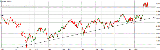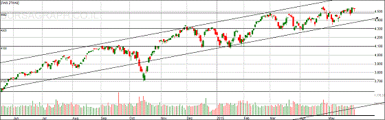 אמנם נשברים שיאים חדשים אבל בניגוד לעבר החולשה מורגשת. למרות זאת, כל עוד נקודות השיא והשפל מסודרות בסדר עולה עלינו להניח המשך עלייה. הנאסדק 100 מתנהל בתוך רצועת המסחר אותה ניתן לצייר בארבע השנים האחרונות והוא קרוב שוב לשיא ופרץ את רמת ה-4480 הנקודות ששמשה כהתנגדות. הצפי הוא המשך עלייה בהתאם למגמה. אם הנאסדק 100 יישאר בקו המגמה העולה הנוכחי אז יעד המחיר הוא 5,000 עד סוף 2015. שבירת רמת ה-4,090 תצביע על יציאה לתיקון אבל אפילו שבירת השפל של 3,700 מטה לא תשנה את המבנה החיובי ויכולה להיות תיקון בלבד. לא סביר שסימני היפוך יגיעו מהמדד הזה. באופן יחסי, בורסות ארצות הברית עולות בקצב איטי יותר מבורסות אירופה ומדד ת"א 25 שהגבירו בחצי השנה האחרונה את קצב העלייה.