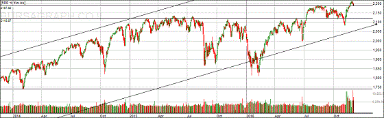שווקי ארצות הברית ובעיקר מדד האס אנד פי 500 והדאו ג'ונס חיוביים. צריך לזכור שהמניות עולות כבר 7.5 שנים, ממרץ 2009, ושאנחנו קרובים לסיום מחזור העלייה אבל לא ברור מתי ועד שנראה סימנים שליליים ההנחה היא המשך עליה. קצב העלייה הוא כ-10% לשנה כך שיעד המחיר לסוף 2017 הוא 2,400-2,450. ירידה כתיקון למהלך העולה עשויה להגיע עד 2120 לכל היותר לפני המשך עלייה.