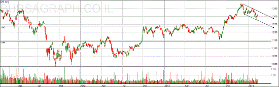 אנחנו נמצאים במגמה יורדת של כמה חדשים והעלייה של השבוע החולף ביחד עם הזמן שעבר הביאו את המחיר מקו המגמה התחתון לאמצע שבין הקו היורד התחתון והקו היורד העליון. המשך עלייה אפשרי צפוי להיעצר ב-1330 לכל היותר לפני המשך ירידה. אם נתבונן בגרף ובקווי המגמה שציירתי עליו נוכל להבחין בקצב ירידת מדד ת"א 25. על פי קצב הירידה, בהנחה והוא לא ישתנה, טווח המחיר בו נהייה בסוף פברואר הוא 1260-1300 נקודות. באופן רשמי המגמה היא שלילית לחודשים הקרובים ואולי אף ליותר מכך. במצב של עליית מחיר, פריצה של רמת ה-1350 נקודות תאותת על סיום הירידה וחזרה למסלול עלייה לקראת שבירת שיא נוסף של כל הזמנים אבל לאור חולשת מדד ת"א 25 סיכויי תרחיש זה נמוכים.