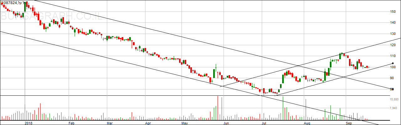 הרצועה היורדת שהחלה באמצע שנת2017 נשברה והיינו מצפים לעליות, אך לא כל שבירה של רצועה יורדת מסמנת על שינוי המגמה ויתכן כי המגמה עדיין שלילית אך המניה תרד בצורה פחות חדה – כמו שאנו רואים בגרף מעל.